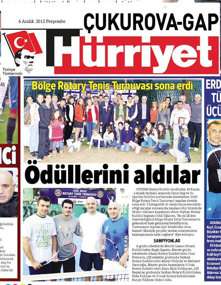Seyhan Rotary Kulübü tarafından 29.kasım.2012 – 02.Aralık.2012 tarihleri arasında düzenlenen 2430.Bölge Rotary Te- nis Turnuvası yapılan kapanış töreni ile sona erdi. Rotaryenler, Rotaryen eşleri ve Rotaryen çocukların katıldığı turnuvada 5 kategoride 41 oyuncu mücadele etti. Açılış kokteyli ve kebap partisiyle renklenen ve bölge Rotaryenlerinin de büyük ilgiyle izlediği turnuvada yapılan final karşılaşmaları sonucunda, A grubu erkeklerde Mersin Lamos Rotary Kulübünden Engin İzgezer, Master grubu erkeklerde Adana Rotary Kulübünden Onur Homurlu, Çift Erkekler grubunda Seyhan Rotary Kulübünden Murat Yıldırım ve Mehmet Saracoğlu, Master grubu bayanlarda 5 Ocak Rotary Kulübünden Banu Elçin Yol- daşcan, Çift Bayanlar grubunda Seyhan Rotary Kulübünden Nida Yıldırım ve 5 Ocak Rotary Kulübünden Burçin Yıldırım şampiyon oldular.Turnuva kapanışında yapılan ödül töreninde şampiyon Rotaryenlere kupalarını veren Seyhan Rotary Kulübü Dönem Başkanı Cenk Uğurses, bu yıl ilki düzenlenen 2430.Bölge Rotary Tenis Turnuvasını geleneksel hale getirmeyi hedeflediklerini ve turnuvanın toplum için “kendinden önce hizmet” ilkesiyle projeler üreten Rotaryenlerin kaynaşmasına katkı sağladığını belirtti.
