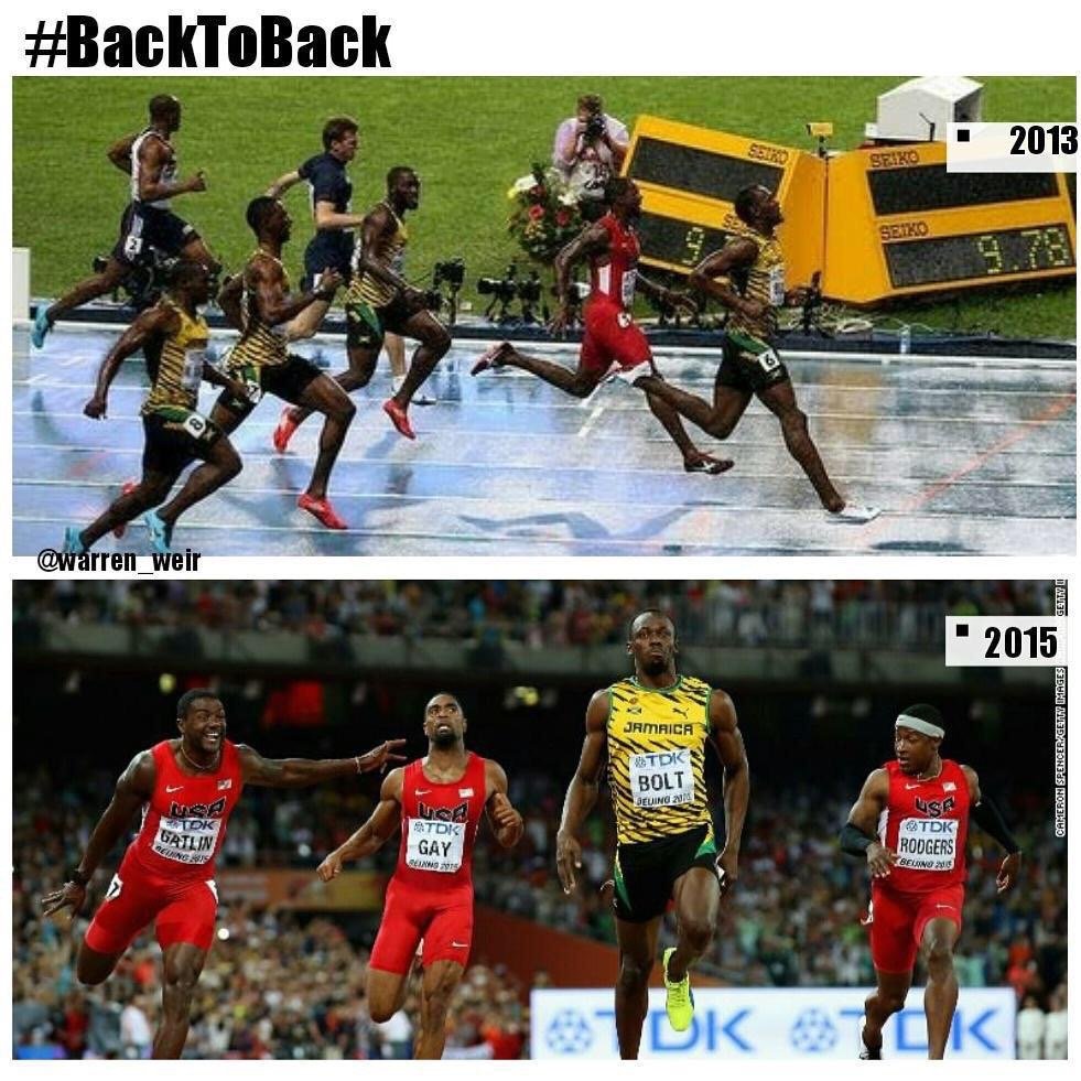 Yarı finalde startı kötü yapıp sendeleyerek ancak foto finish ile finale kalan Bolt, en büyük handikapı olan kötü startı finalde tekrarlamasına rağmen 9,79 ile yine Dünya Şampiyonu oldu.